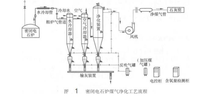 密閉電石爐生產(chǎn)煤氣凈化工藝流程是:荒煤氣先經(jīng)水冷管道冷卻,再經(jīng)粉塵,焦油沉降器,約50%的粉塵在此除去,再依次通達空氣冷卻器捕集焦油冷卻器將煙氣溫度降至220?250℃,然后進入袋式除塵器.